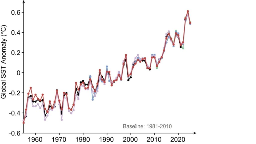 Încălzirea oceanelor a fost inegală, cea mai mare acumulare de căldură fiind înregistrată în oceanele tropicale, Atlanticul de Sud, Marea Mediterană, nordul Oceanului Indian și Oceanul de Sud. Temperaturile medii la suprafață au scăzut ușor în 2025 din cauza tranziției de la El Niño la La Niña, dar au rămas a treia cea mai mare înregistrată vreodată.