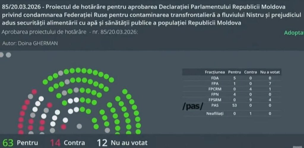 Parlamentul Republicii Moldova condamnă ferm acțiunile Federației Ruse care au dus la contaminarea transfrontalieră a fluviului Nistru, la afectarea securității alimentării cu apă și a sănătății publice. Deputații au aprobat o declarație de condamnare, care reflectă poziția Parlamentului în raport cu criza ecologică generată.