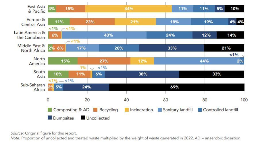 Un raport al Băncii Mondiale arată că acoperirea colectării deșeurilor este aproape de 100% în țările cu venituri mari. Între timp, situația este gravă în țările sărace, în special în Africa Subsahariană, unde doar 31% din deșeuri sunt colectate centralizat. O tendință similară se observă și în cazul reciclării. În țările bogate, aproape 100% din deșeurile municipale solide sunt procesate în instalații controlate. În țările sărace, ratele de reciclare sunt extrem de scăzute – doar 3%. Majoritatea deșeurilor sunt fie depozitate în gropile de gunoi, fie nu sunt colectate deloc.